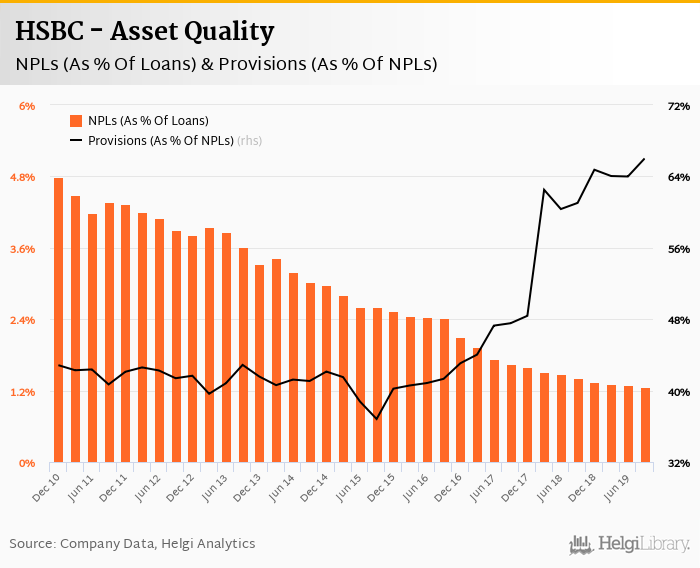 HSBC's non-performing loans reached 1.27% of total loans at the end of 2019-09-30, down from 1.40% compared to the previous year. Historically, the NPL ratio hit an all time high of 4.79% in 2010-12-31 and an all time low of 1.27% in 2019-09-30.