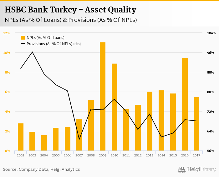 HSBC Bank Turkey's non-performing loans reached 5.46% of total loans at the end of 2017, down from 9.45% compared to the previous year. Historically, the NPL ratio hit an all time high of 11.0% in 2009 and an all time low of 1.59% in 2004.