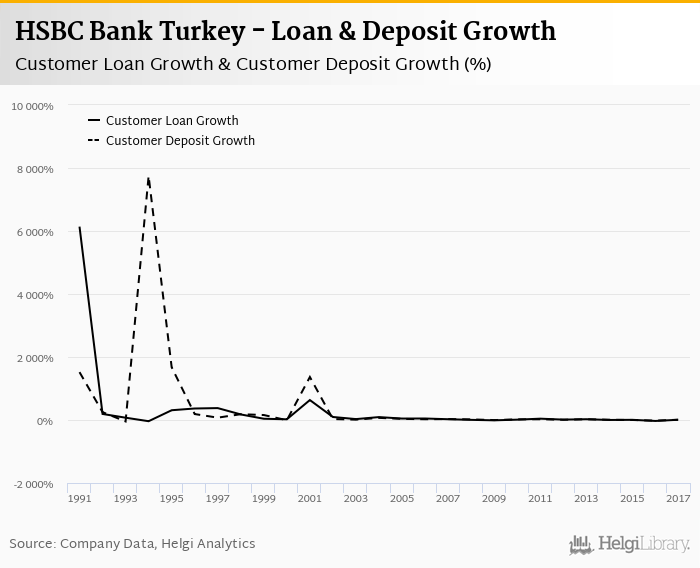 HSBC Bank Turkey's customer loan growth reached 7.68% in 2017, up from -30.7% compared to the previous year. Historically, the bank’s loans growth reached an all time high of 6,139% in 1991 and an all time low of -38.6% in 1994. In the last decade, the average annual loan growth amounted to 4.91%.