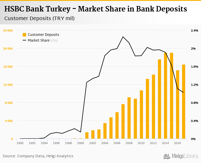 HSBC Bank Turkey accounted for 1.02% of all customer deposits taken by banks in Turkey at the end of 2017. Historically, the bank’s market share in customer deposits reached an all time high of 2.25% in 2007 and an all time low of < 0.001% in 1990.