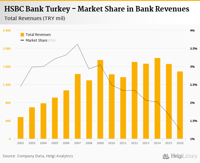 As a result, HSBC Bank Turkey accounted for 1.23% of all bank revenues generated by banks in Turkey in 2016. Historically, the bank’s market share in total revenues reached an all time high of 3.61% in 2007 and an all time low of 1.23% in 2016.