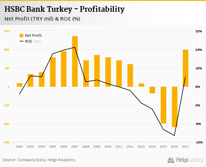 HSBC Bank Turkey made a net profit of TRY 299 mil in 2017, up 192% compared to the previous year. This implies a return on equity of 12.3%.