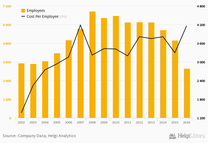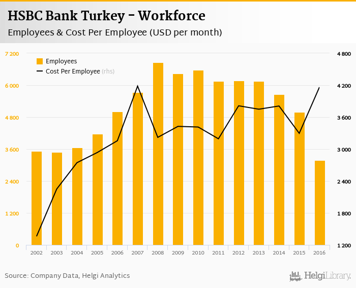 HSBC Bank Turkey employed 3,188 persons in 2016, down 36.2% when compared to the previous year. Historically, the bank's workforce hit an all time high of 6,853 persons in 2008 and an all time low of 3,188 in 2016.