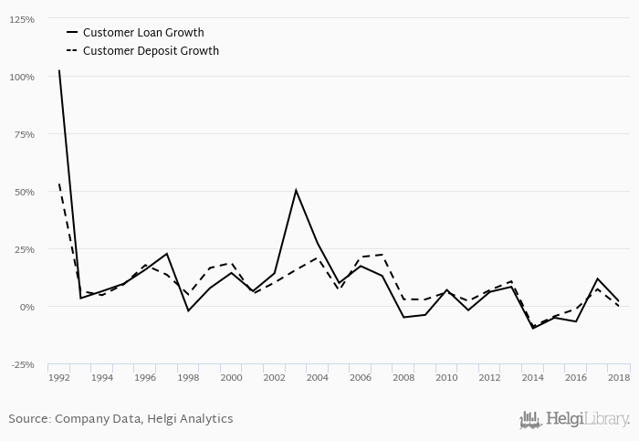 On the other hand, bank's customer deposit growth amounted to -0.139% at the end of 2018, down from 7.24% when compared to the previous year. Historically, the bank’s deposit growth reached an all time high of 53.0% in 1992 and an all time low of -8.92% in 2014. In the last decade, the average annual loan growth amounted to 1.91%.