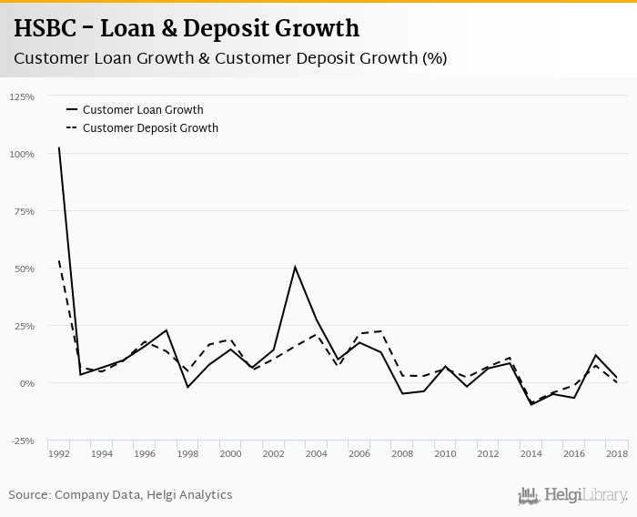 HSBC's customer loan growth reached 1.95% in 2018, down from 11.8% compared to the previous year. Historically, the bank’s loans growth reached an all time high of 103% in 1992 and an all time low of -9.78% in 2014. In the last decade, the average annual loan growth amounted to 0.511%.