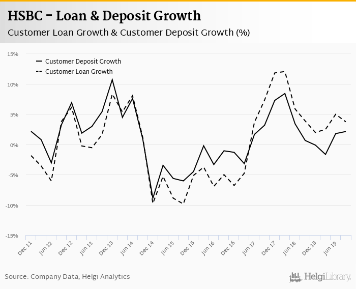 HSBC's customer loan growth reached 3.70% in 2019-09-30, down from 3.84% compared to the previous year. Historically, the bank’s loans growth reached an all time high of 12.0% in 2018-03-31 and an all time low of -9.86% in 2015-09-30. In the last decade, the average annual loan growth amounted to 0%.