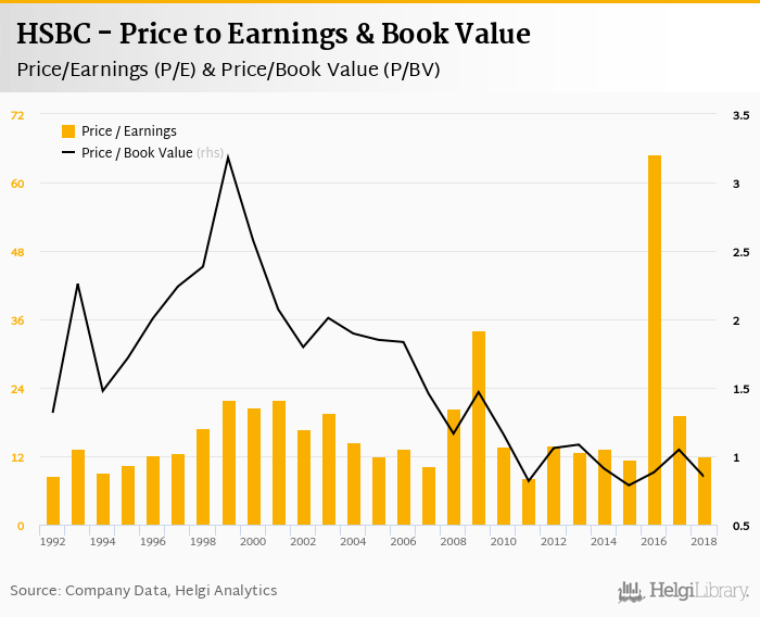 At the end of 2018, the bank traded at price to earnings of 12.0x. Within the last five years, the multiple reached an all time high of 65.0x in 2016 and an all time low of 11.5x in 2015 with an average of 24.2x.