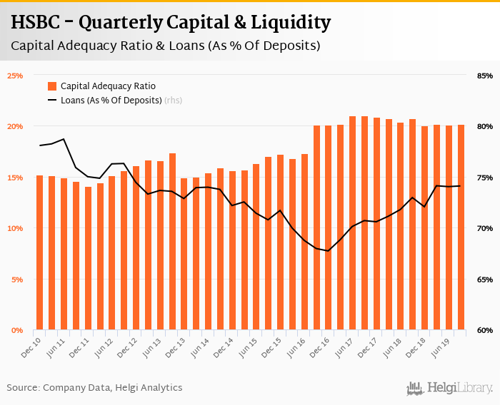 HSBC's capital adequacy ratio reached 20.2% at the end of third quarter of 2019, up from 20.1% when compared to the previous quarter. Historically, the bank’s capital ratio hit an all time high of 21.0% in 2Q2017 and an all time low of 14.1% in 4Q2011.