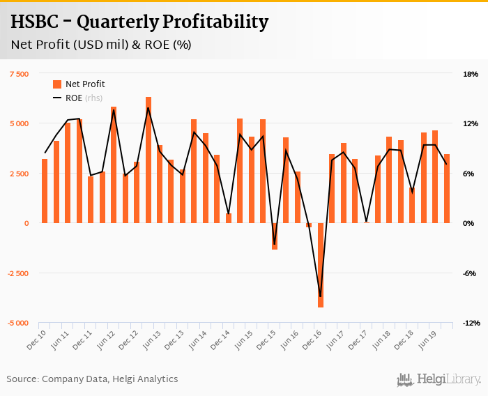 HSBC made a net profit of USD 3,477 mil in the third quarter of 2019, down 16.9% when compared to the same period of last year. This implies a return on equity of 6.98%.