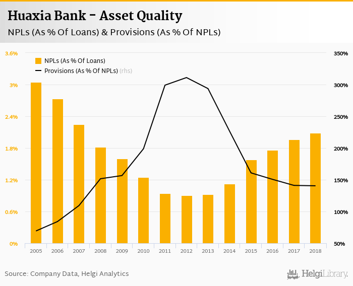 Huaxia Bank's non-performing loans reached 2.09% of total loans at the end of 2018, up from 1.96% compared to the previous year. Historically, the NPL ratio hit an all time high of 3.05% in 2005 and an all time low of 0.906% in 2012.