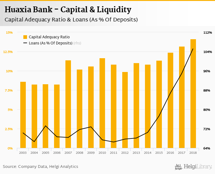 Huaxia Bank's capital adequacy ratio reached 14.1% at the end of 2018, up from 13.2% compared to the previous year. Historically, the bank’s capital ratio hit an all time high of 14.1% in 2018 and an all time low of 8.27% in 2004.