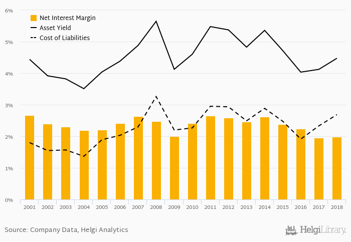 Historically, the bank’s net interest margin reached an all time high of 2.66% in 2001 and an all time low of 1.95% in 2017. The average margin in the last five years amounted to 2.23%.