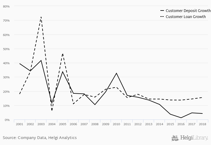 On the other hand, bank's customer deposit growth amounted to 4.21% at the end of 2018, down from 4.67% when compared to the previous year. Historically, the bank’s deposit growth reached an all time high of 41.6% in 2003 and an all time low of 1.21% in 2016. In the last decade, the average annual loan growth amounted to 11.9%.