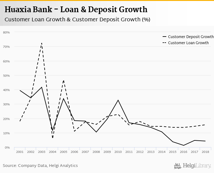 Huaxia Bank's customer loan growth reached 15.5% in 2018, up from 14.5% compared to the previous year. Historically, the bank’s loans growth reached an all time high of 72.3% in 2003 and an all time low of 5.81% in 2004. In the last decade, the average annual loan growth amounted to 16.3%.
