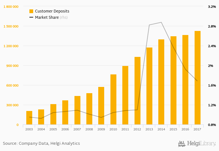 Huaxia Bank's customer deposits reached CNY 1,428,860 mil in 2017, up 4.67% compared to the previous year.