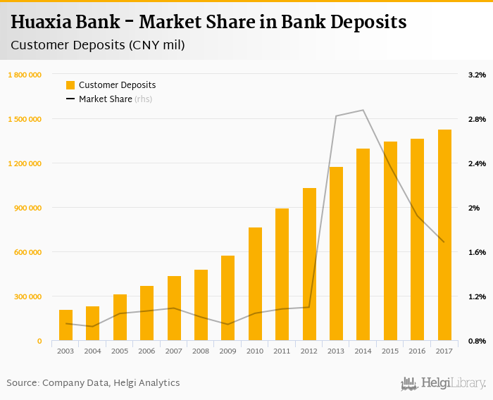 Huaxia Bank accounted for 1.68% of all customer deposits taken by banks in China at the end of 2017. Historically, the bank’s market share in customer deposits reached an all time high of 2.87% in 2014 and an all time low of 0.923% in 2004.