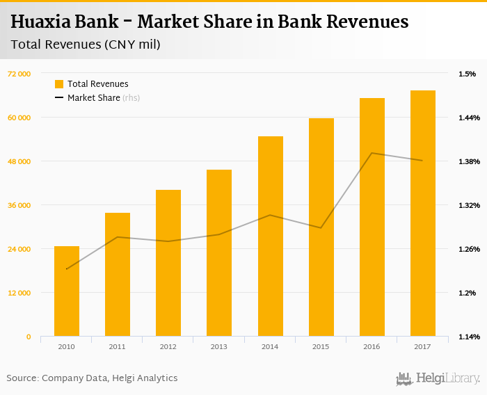 Huaxia Bank generated total banking revenues of CNY 67,432 mil in 2017, up 3.23% compared to the previous year.