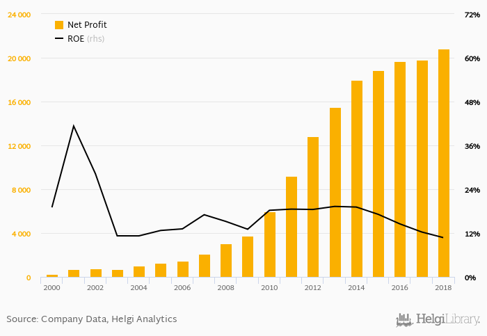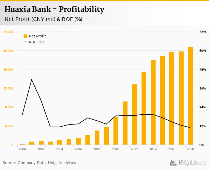 Huaxia Bank made a net profit of CNY 20,854 mil in 2018, up 5.22% compared to the previous year. This implies a return on equity of 10.7%.