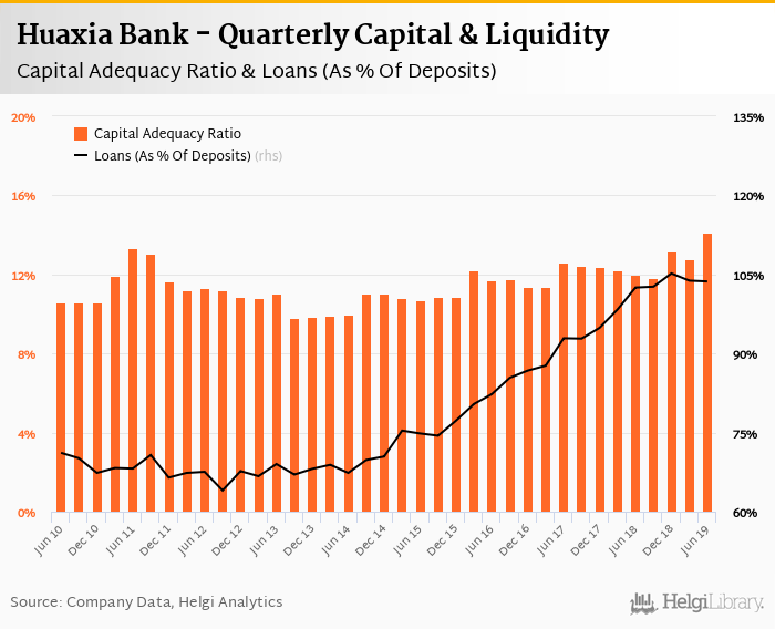 Huaxia Bank's capital adequacy ratio reached 14.1% at the end of second quarter of 2019, up from 12.8% when compared to the previous quarter. Historically, the bank’s capital ratio hit an all time high of 14.1% in 2Q2019 and an all time low of 9.81% in 3Q2013.