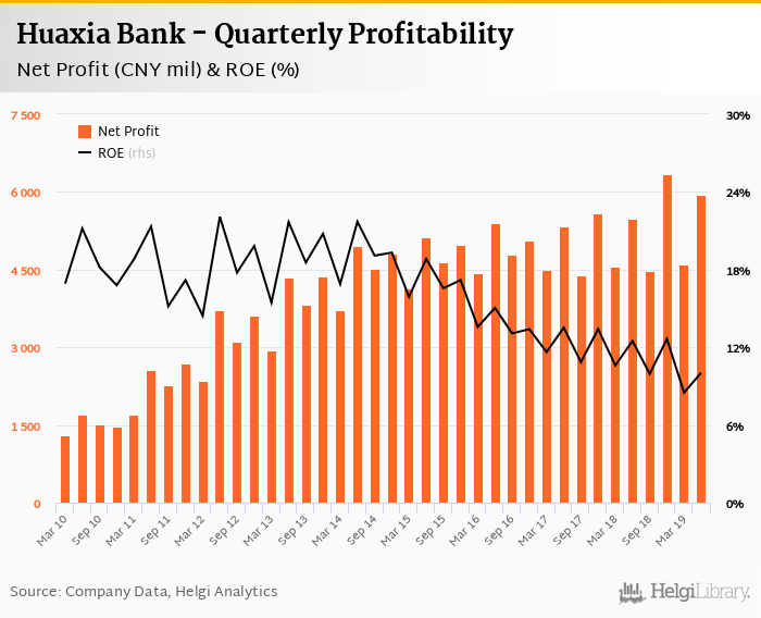 Huaxia Bank made a net profit of CNY 5,939 mil in the second quarter of 2019, up 8.26% when compared to the same period of last year. This implies a return on equity of 10.0%.