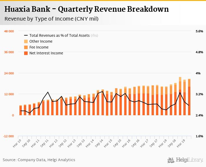 Huaxia Bank generated total banking revenues of CNY 20,813 mil in the second quarter of 2019, up 18.5% when compared to the same period of last year and 3.08% when compared to the previous quarter.