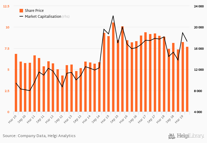 Over the last five years, the stock has appreciated by 35.2 % implying an annual average growth of 6.22 %. In absolute terms, the value of the company rose by USD 5,378 mil.