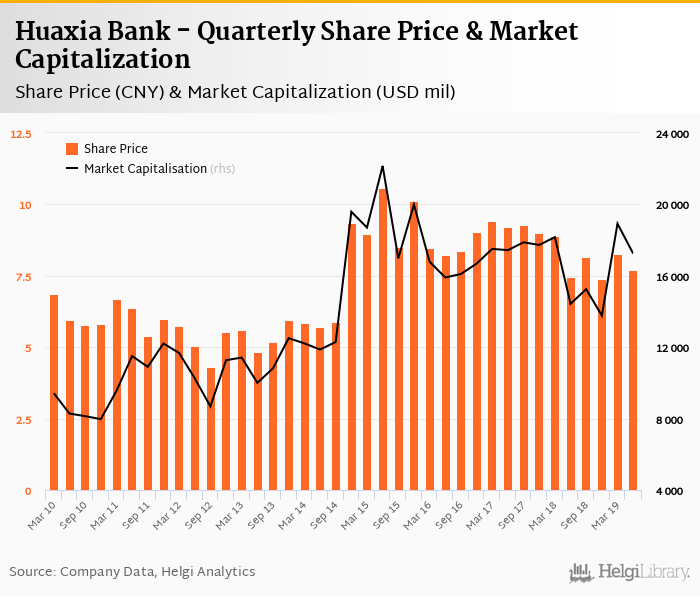 Huaxia Bank stock traded at CNY 7.70 per share at the end of second quarter of 2019 implying a market capitalization of USD 17,246 mil.