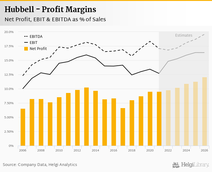 Hubbell made a net profit of USD 400 mil with revenues of USD 4,194 mil in 2021, up by 13.8% and up by 13.9%, respectively, compared to the previous year.