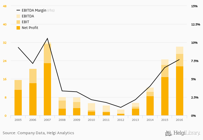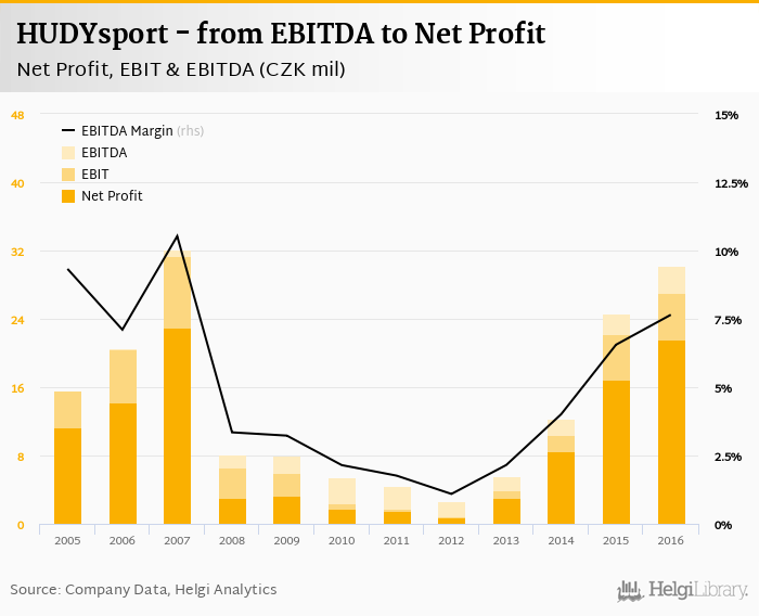 HUDYsport made a net profit of CZK 21.6 mil with revenues of CZK 395 mil in 2016, up by 27.9% and up by 4.85%, respectively, compared to the previous year. This translates into a net margin of 5.46%.