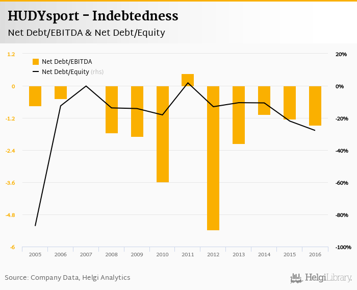 HUDYsport's net debt stood at CZK -44.1 mil and accounted for -27.8% of equity at the end of 2016. The ratio is down 5.85 pp compared to the previous year.