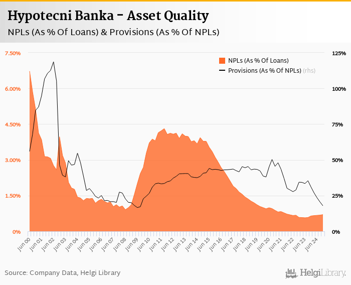 Comparing Hypotecni Banka with its closest peers, Ceska Sporitelna operated at the end of 2024-12-31 with NPL ratio of 1.80% and provision coverage of 102%, CSOB with 1.43% and 43.6% respectively and Komercni Banka had 1.94% of bad loans covered with 44.3% by provisions at the end of 2024-12-31.