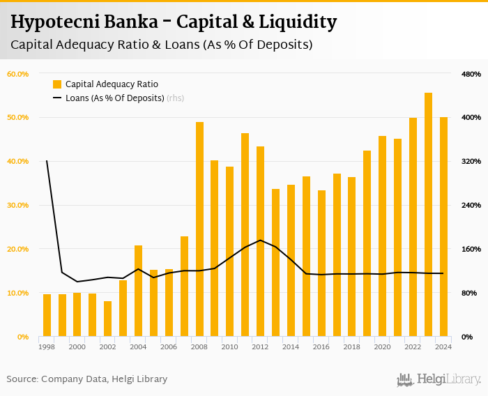 Hypotecni Banka's capital adequacy ratio reached 50.2% at the end of 2024, down from 55.7% compared to the previous year. Historically, the bank’s capital ratio hit an all time high of 55.7% in 2023 and an all time low of 8.16% in 2002.