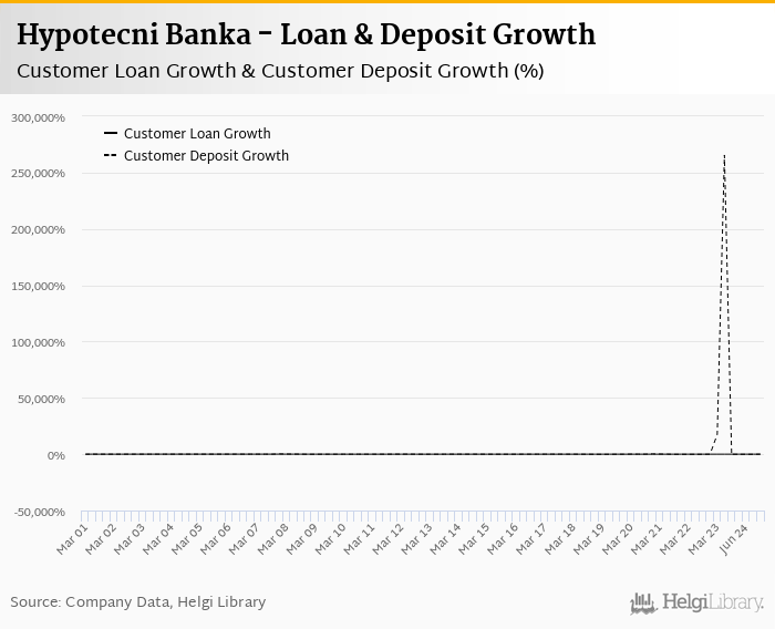 Hypotecni Banka's customer loan growth reached 6.55% in 2024-12-31, up from 4.05% compared to the previous year. Historically, the bank’s loans growth reached an all time high of 48.5% in 2007-12-31 and an all time low of 3.34% in 2023-06-30. In the last decade, the average annual loan growth amounted to 7.17%.