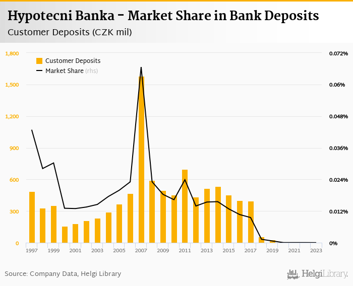 Hypotecni Banka accounted for < 0.001% of all customer deposits taken by banks in Czechia at the end of 2023. Historically, the bank’s market share in customer deposits reached an all time high of 0.067% in 2007 and an all time low of < 0.001% in 2023.