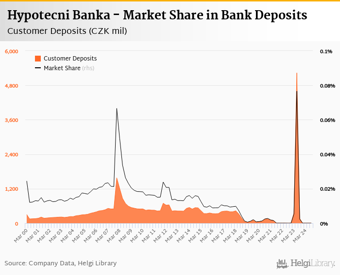 Hypotecni Banka accounted for < 0.001% of all customer deposits taken by banks in Czechia at the end of 2024-09-30. Historically, the bank’s market share in customer deposits reached an all time high of 0.077% in 2023-06-30 and an all time low of 0% in 2022-09-30.