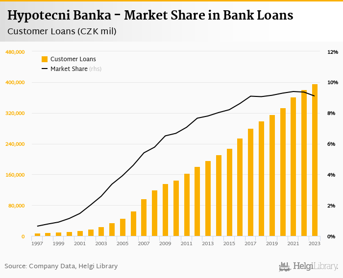 Hypotecni Banka accounted for 9.10% of all customer loans issued in Czechia at the end of 2023. Historically, the bank’s market share in customer loans reached an all time high of 9.39% in 2021 and an all time low of 0.633% in 1997.