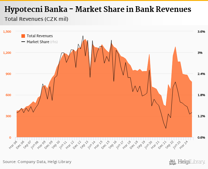 As a result, Hypotecni Banka accounted for 1.30% of all bank revenues generated by banks in Czechia in 2024-09-30. Historically, the bank’s market share in total revenues reached an all time high of 3.47% in 2013-03-31 and an all time low of 0.848% in 2021-12-31.
