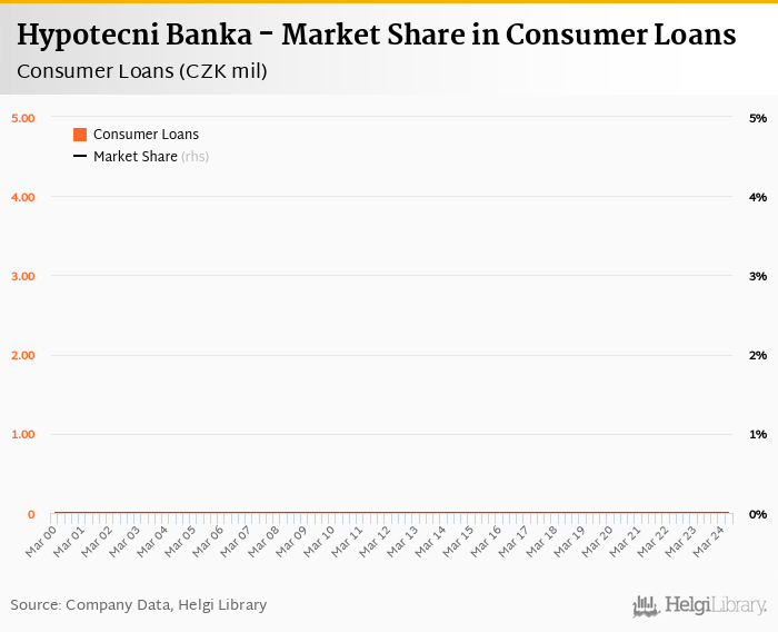 Hypotecni Banka's consumer loans reached CZK 0 mil in 2024-06-30, down 0% compared to the previous year.