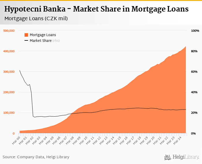 Hypotecni Banka accounted for 23.0% of all mortgage loans issued in Czechia at the end of 4Q2024. Historically, the bank’s market share in mortgage loans reached an all time high of 61.1% in 1Q2000 and an all time low of 15.5% in 2Q2002.