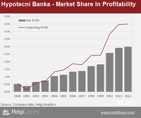 Despite being a pure mortgage lender (not accepting deposits such as other banks), Hypoteční Banka held around 3-5% market share in terms of total banking revenues, assets, or profitability in the Czech banking system at the end of 2012
