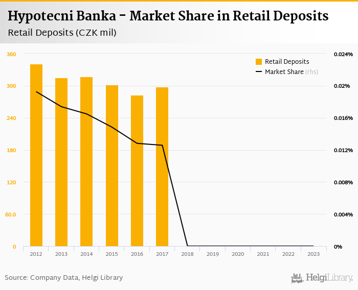 Hypotecni Banka accounted for 0% of all retail deposits taken by banks in Czechia at the end of 2023. Historically, the bank’s market share in retail deposits reached an all time high of 0.019% in 2012 and an all time low of 0% in 2018.