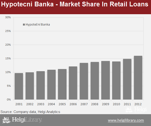 Despite being a pure mortgage lender (not accepting deposits or providing consumer or corporate loans), Hypoteční Banka held around 3-5% market share in terms of total banking revenues, assets, or profitability in the Czech banking system at the end of 2012.
