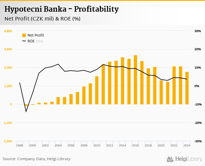 Hypotecni Banka made a net profit of CZK 2,126 mil in 2024, down 14.3% compared to the previous year. This implies a return on equity of 3.63%.