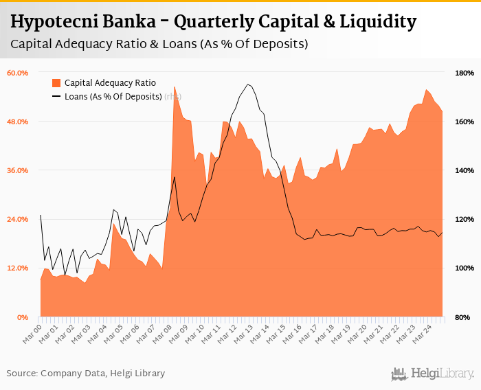 Hypotecni Banka's capital adequacy ratio reached 50.2% at the end of fourth quarter of 2024, down from 51.8% when compared to the previous quarter. Historically, the bank’s capital ratio hit an all time high of 56.4% in 2Q2008 and an all time low of 8.16% in 4Q2002.