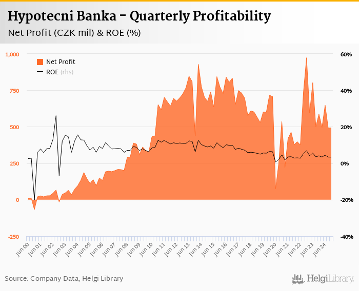 Hypotecni Banka made a net profit of CZK 492 mil in the fourth quarter of 2024, down 16.1% when compared to the same period of last year. This implies a return on equity of 3.34%.