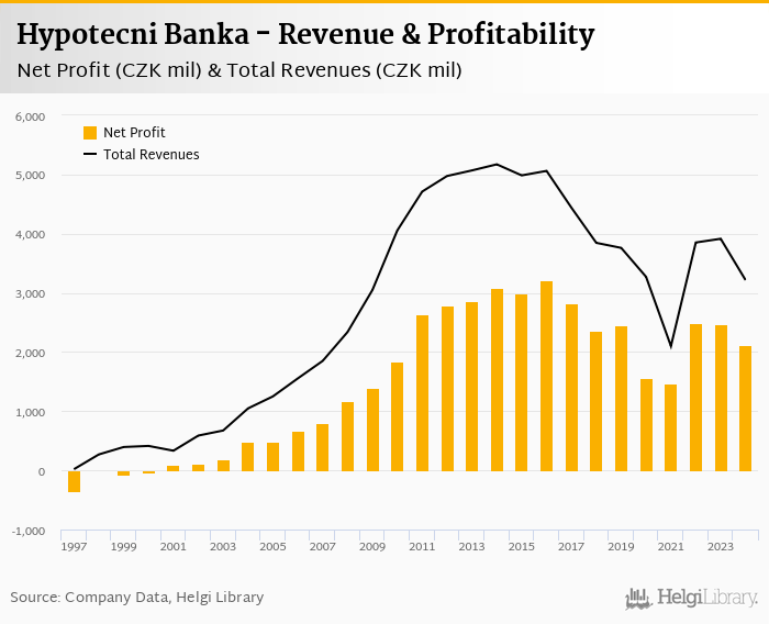 Hypotecni Banka made a net profit of CZK 2,126 mil under revenues of CZK 3,216 mil in 2024, up -14.3% and -17.8% respectively compared to the previous year.