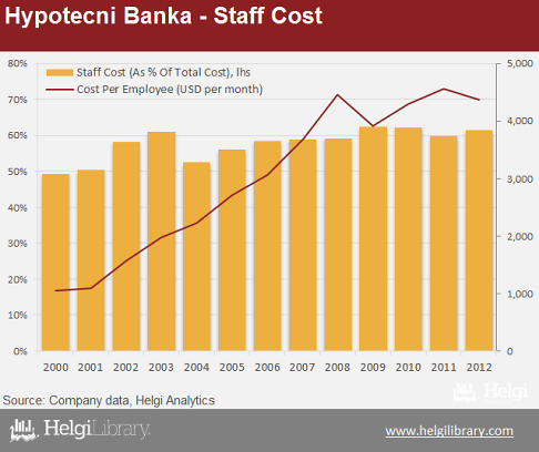 The Bank had 472 employees in 2012. Since 2000, the staff costs increased from around 50% to over 60% of total cost in 2012. More interestingly, average staff cost had increased more than four-fold in the same period, from USD 1,000 per person and month to USD 4,368 in 2012.