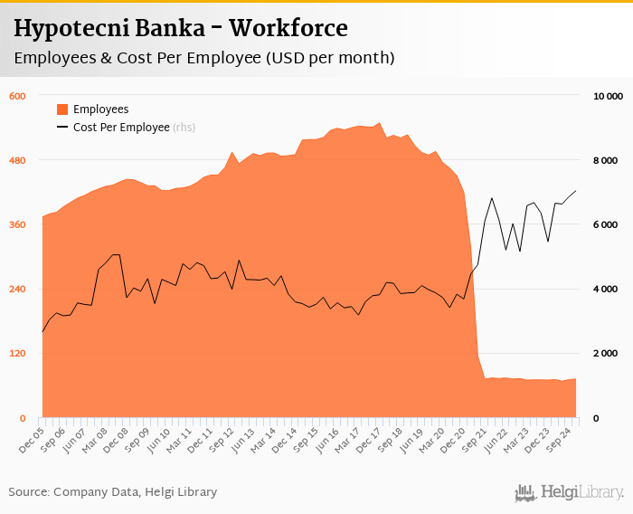 Comparing Hypotecni Banka with its closest peers, Ceska Sporitelna had 9,674 employees and 337 branches in 2024-12-31, CSOB operated with 8,075 people and 198 branches and Komercni Banka had a network of 204 branches with 7,456 employees in 2024-12-31.