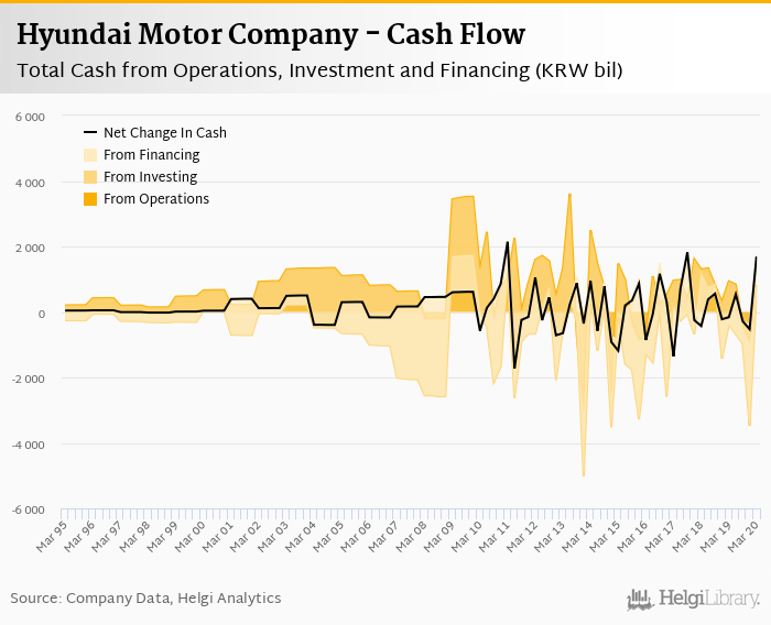Hyundai Motor Company's operating cash flow stood at KRW 822 bil in 1Q2020, down 12.1% when compared to the previous year. Historically, between 1Q1995 - 1Q2020, the firm’s operating cash flow reached a high of KRW 3,612 bil in 2Q2013 and a low of KRW -3,032 bil in 4Q2013.