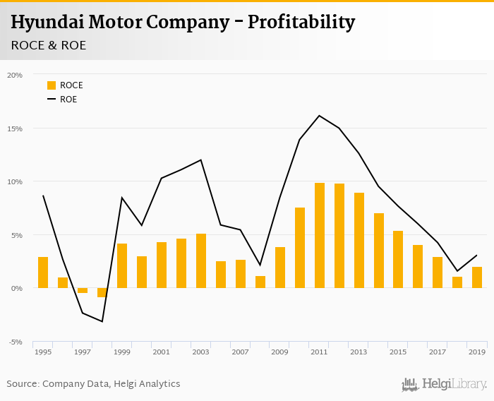 Hyundai Motor Company made a net profit of KRW 2,980 bil in 2019, up 97.6% compared to the previous year. Historically, between 1995 and 2019, the company's net profit reached a high of KRW 8,562 bil in 2012 and a low of KRW -68.8 bil in 1998.